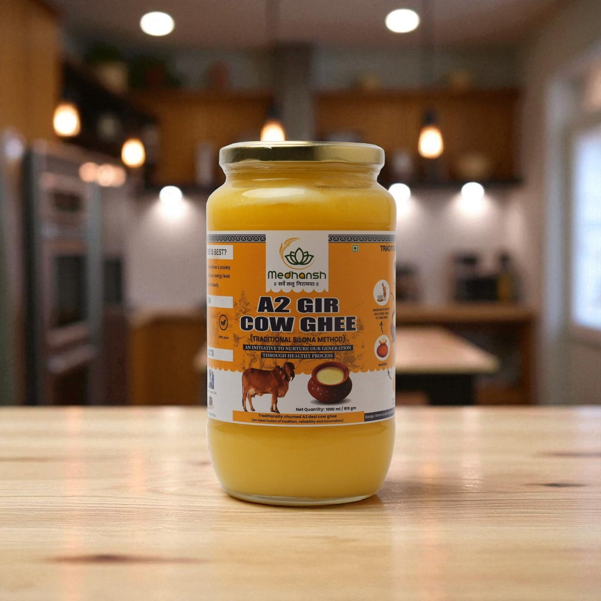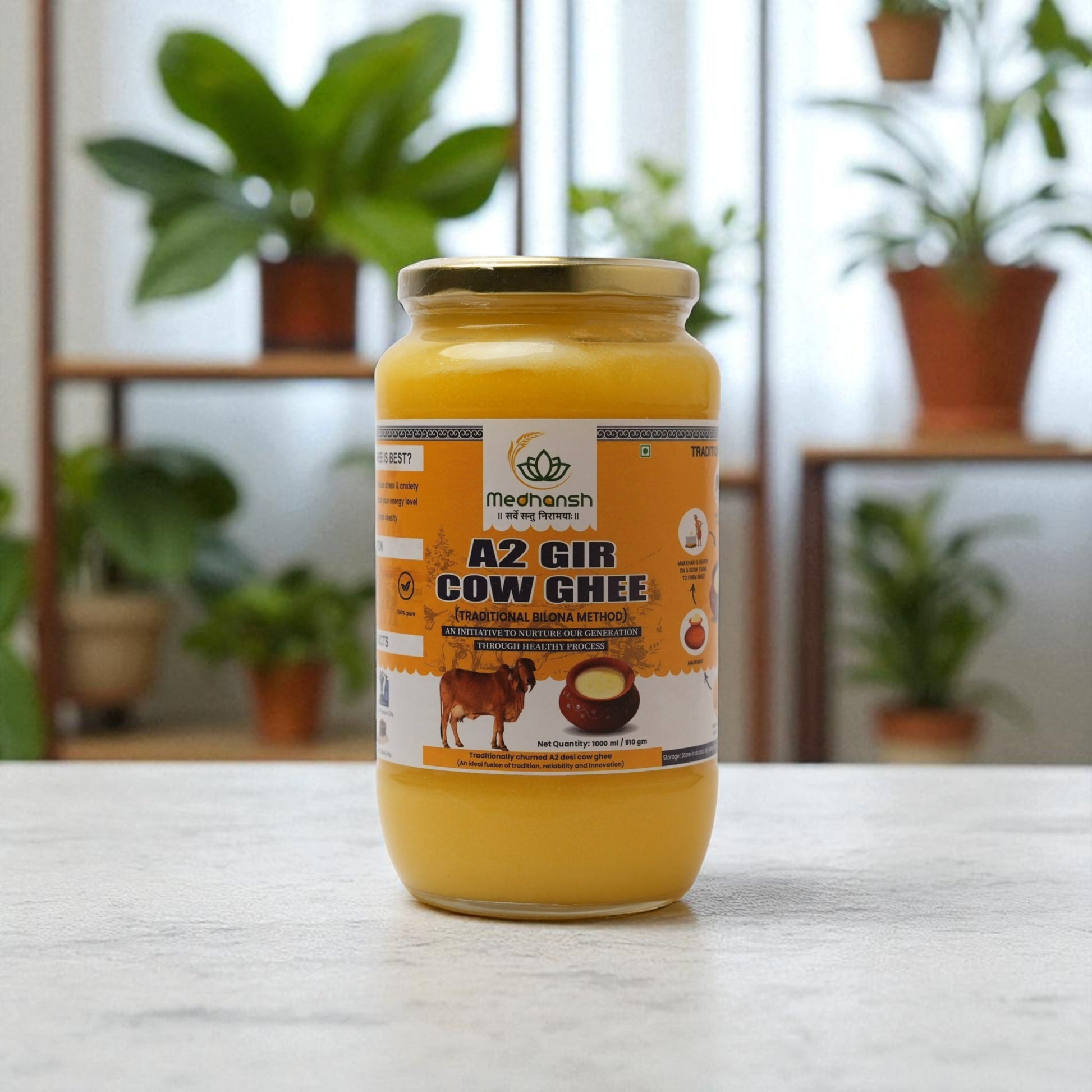 Vedic Medhansh A2 Gir Cow Ghee is pure, hand-churned (bilona method) ghee made from the milk of desi Gir cows. Known for its rich nutrition, authentic taste, and ayurvedic healing properties, our ghee is perfect for cooking, health, and overall wellness.